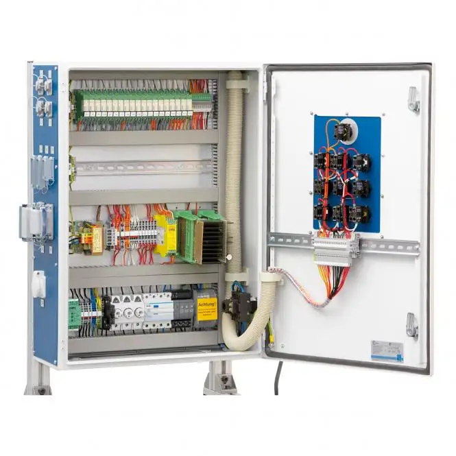 Thiết kế mô-đun cho phép bạn tái sử dụng tủ điện trong các tình huống học tập sau này, có thể bằng các mô-đun mở rộng của chúng tôi hoặc tự tùy chỉnh thêm. Bạn có thể kết nối các mô hình chức năng thông qua giao diện ở vách bên (cảm biến, thiết bị truyền động, mạch an toàn, động cơ). Tủ điện có kích thước phù hợp với bàn làm việc và có thể thao tác dễ dàng dù đang đứng hay ngồi.